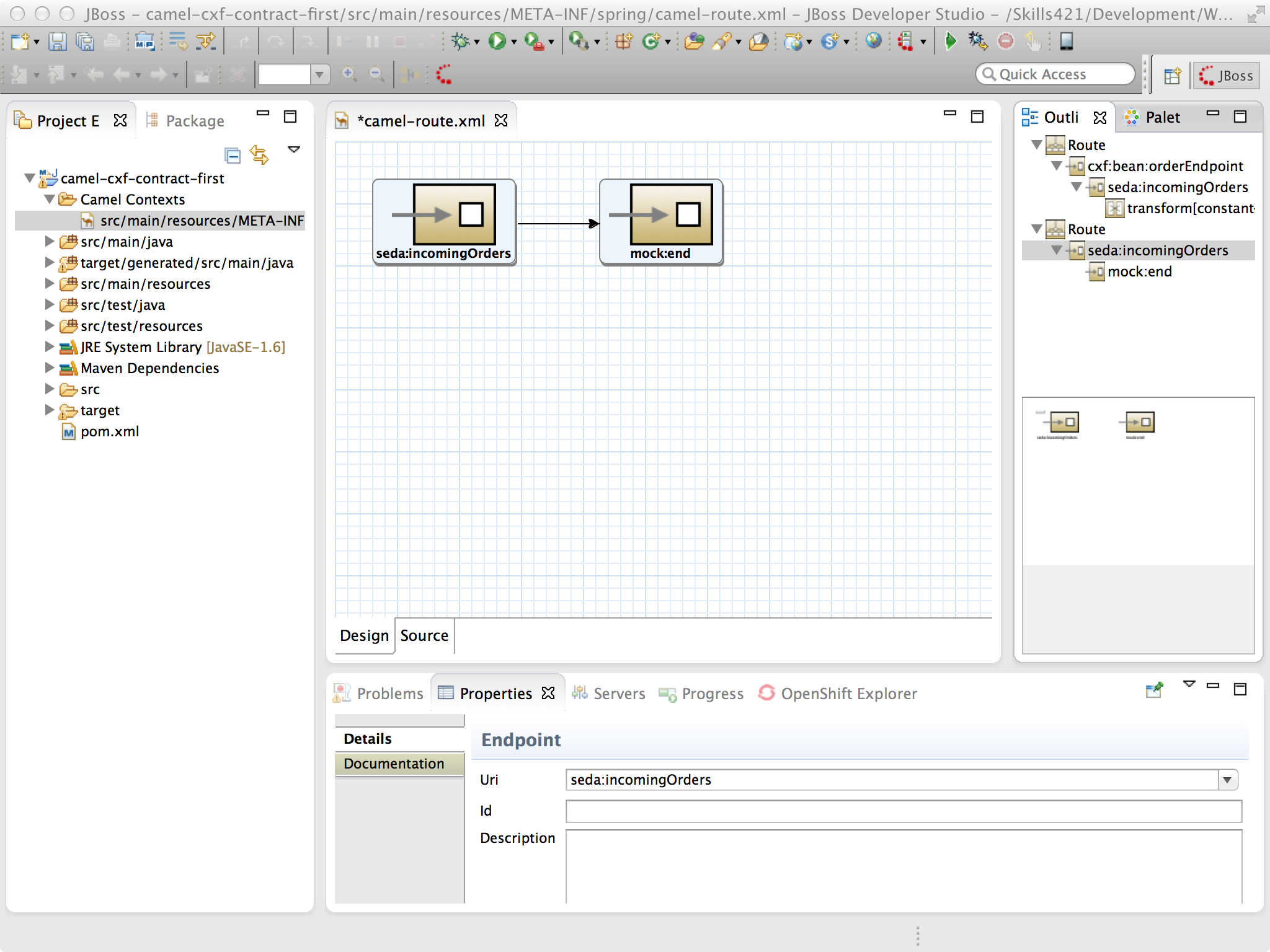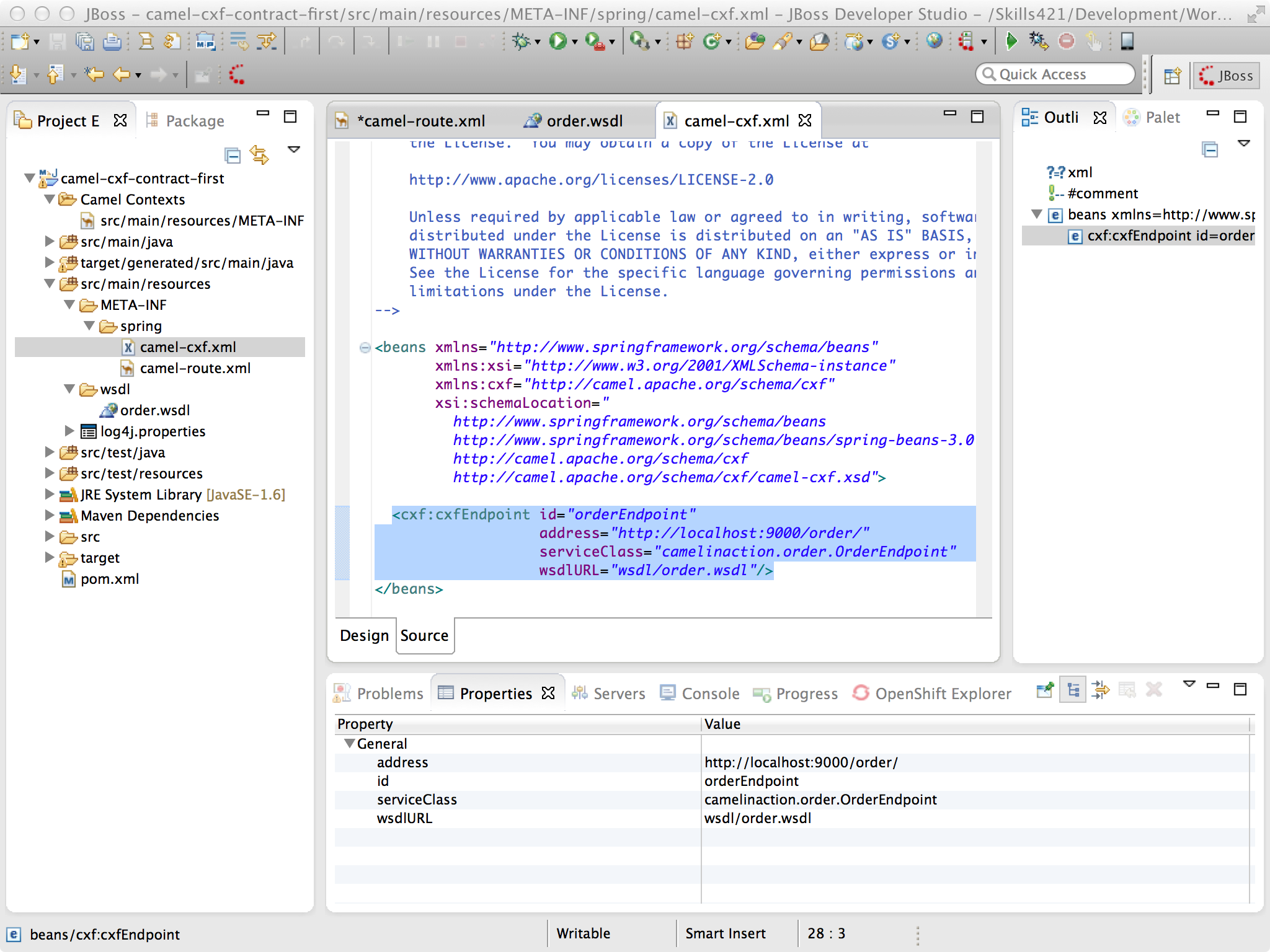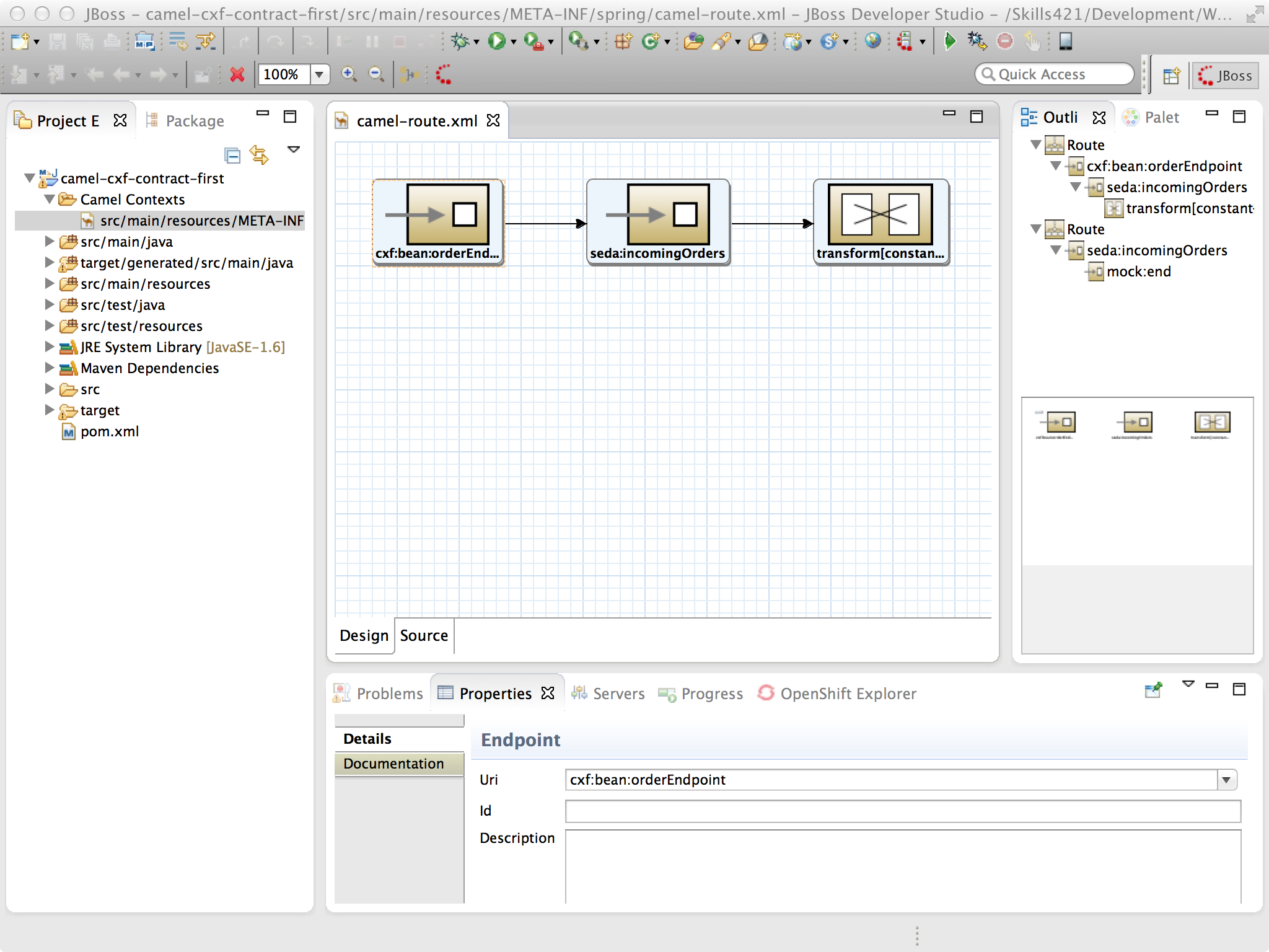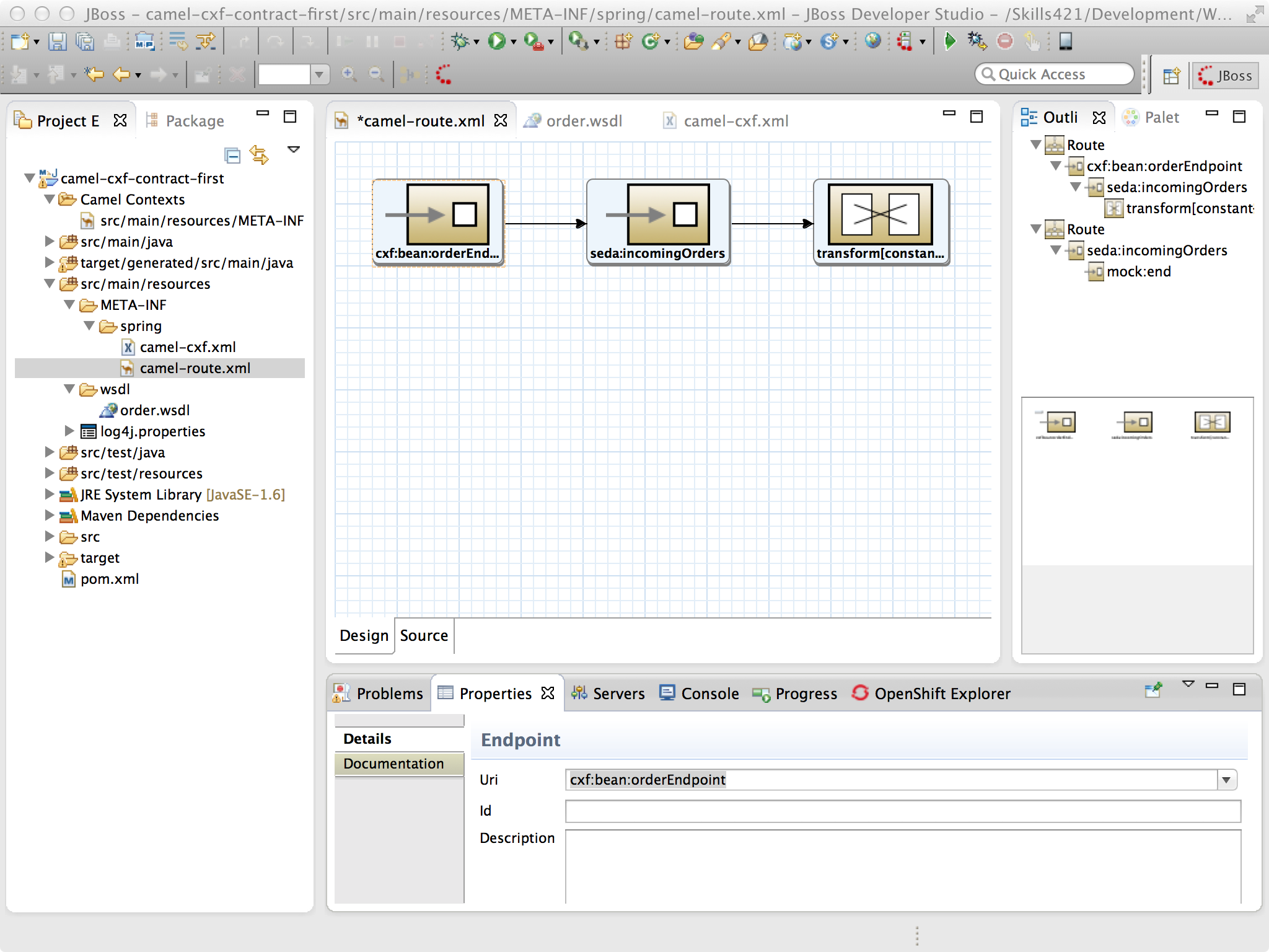 If we click on the Design tab for camel-cxf.xml, and click on the endpoint in the diagram; the properties tab will show that the Uri for the endpoint is: cxf:bean:orderEndpoint