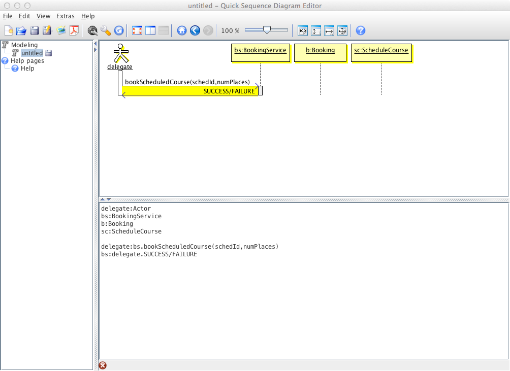 into the bottom panel enter the following text to add an Actor and objects for a BookingService, Booking and SchedulesCourse