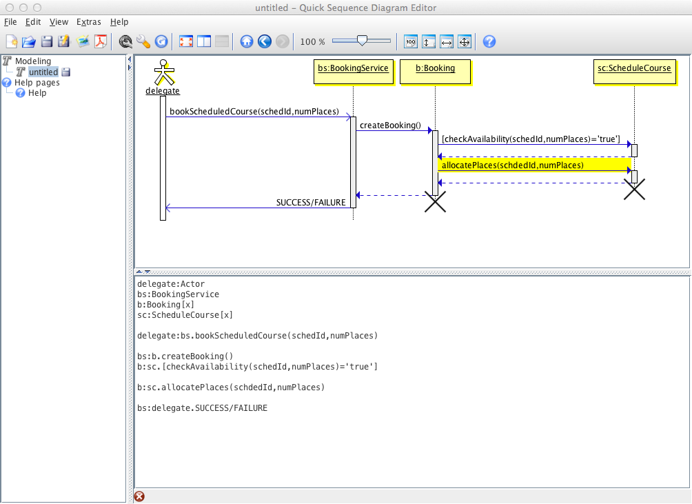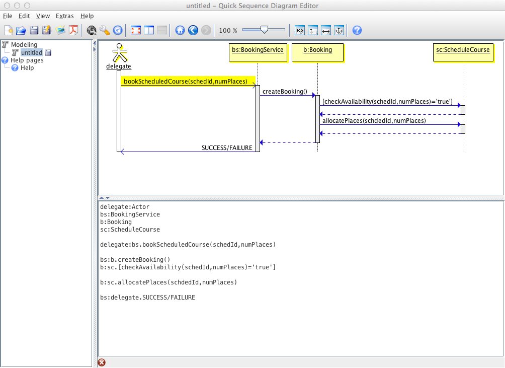 delegate:Actor bs:BookingService b:Booking[x] sc:ScheduleCourse[x] delegate:bs.bookScheduledCourse(schedId,numPlaces) bs:b.createBooking() b:sc.[checkAvailability(schedId,numPlaces)='true'] b:sc.allocatePlaces(schdedId,numPlaces) bs:delegate.SUCCESS/FAILURE