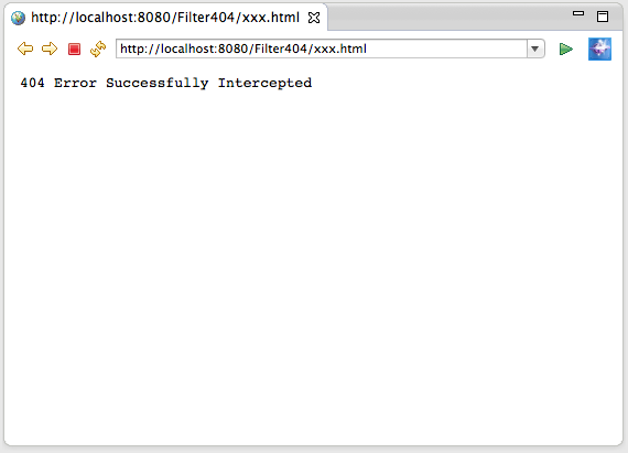 http://localhost:8080/Filter404/index.jsp http://localhost:8080/Filter404/xxx.html We have successfully created the code to intercept a 404 Page Not Found error message from the Server and replace the page with a success status and our custom content.