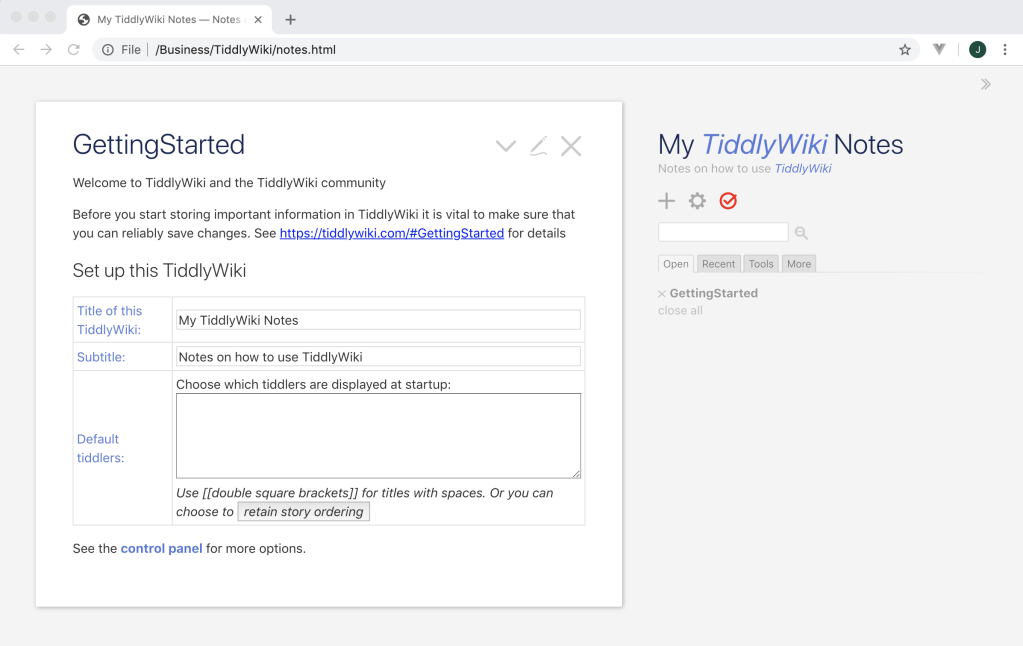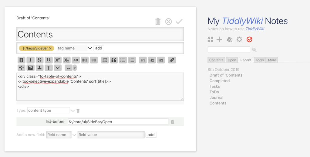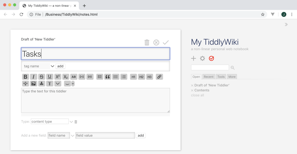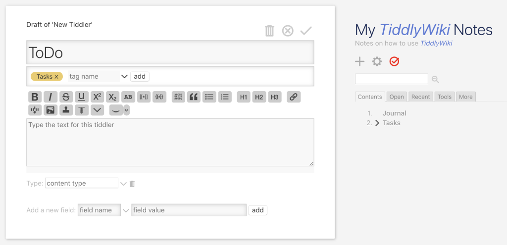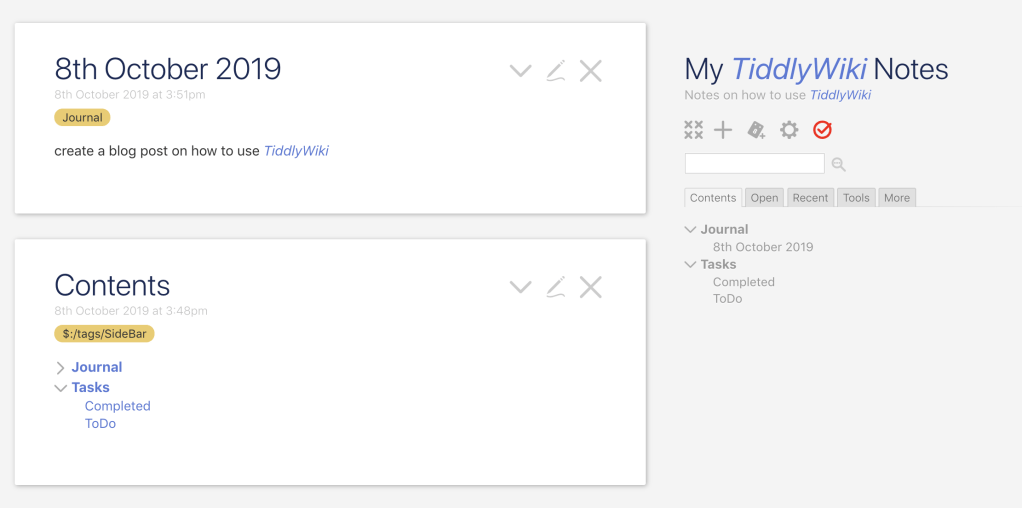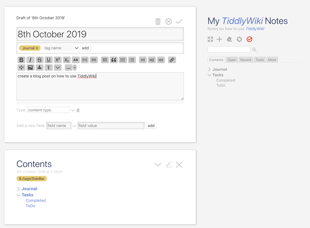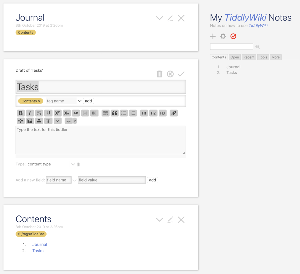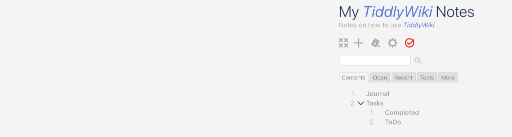 In this post we are going to create a simple TiddlyWiki page with a Contents tab that contains a Journal and Tasks.