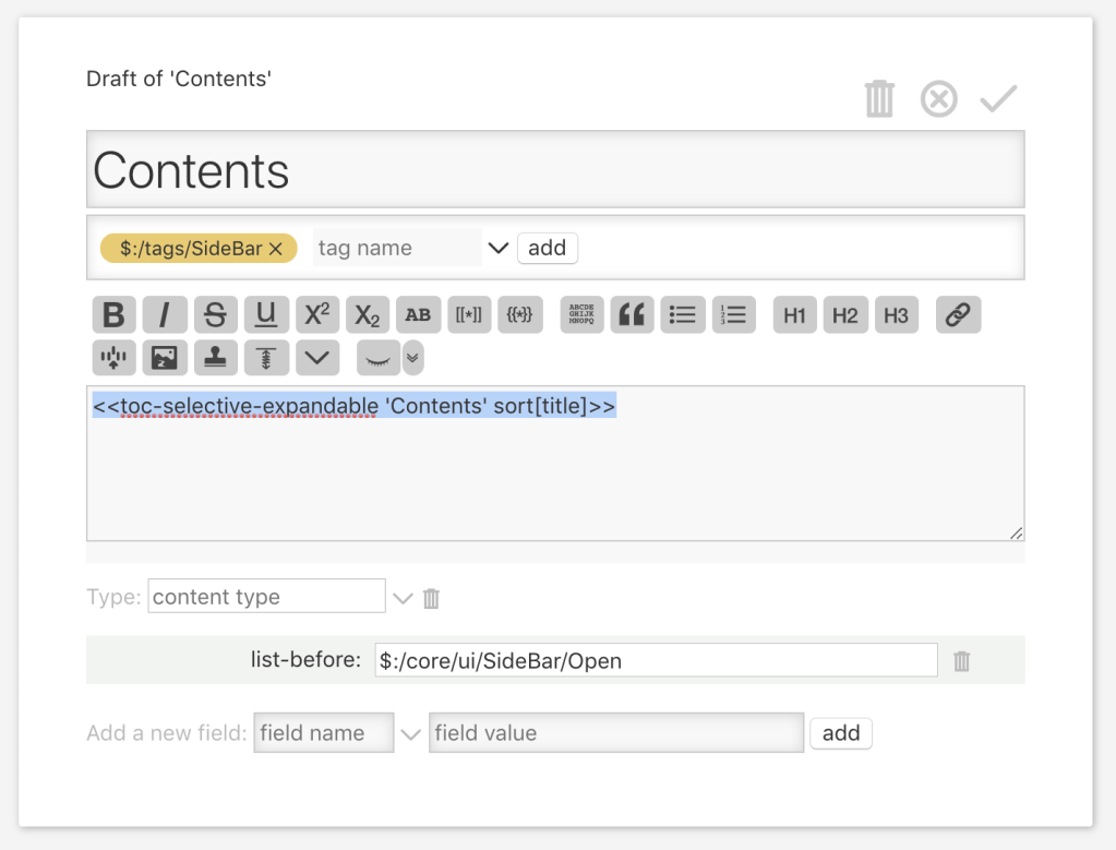 This tells the Wiki to display a selective exandable table of contents, using as a source all the tiddlers with a tagname of Contents and to sort those tiddlers by title